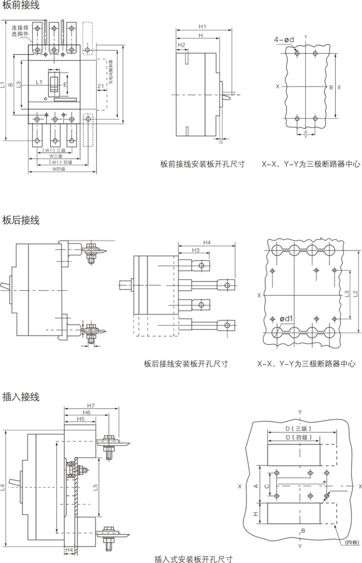 ◇According to the wiring method of the circuit breaker: a wiring in front of the board; b wiring behind the board; c plug-in type.